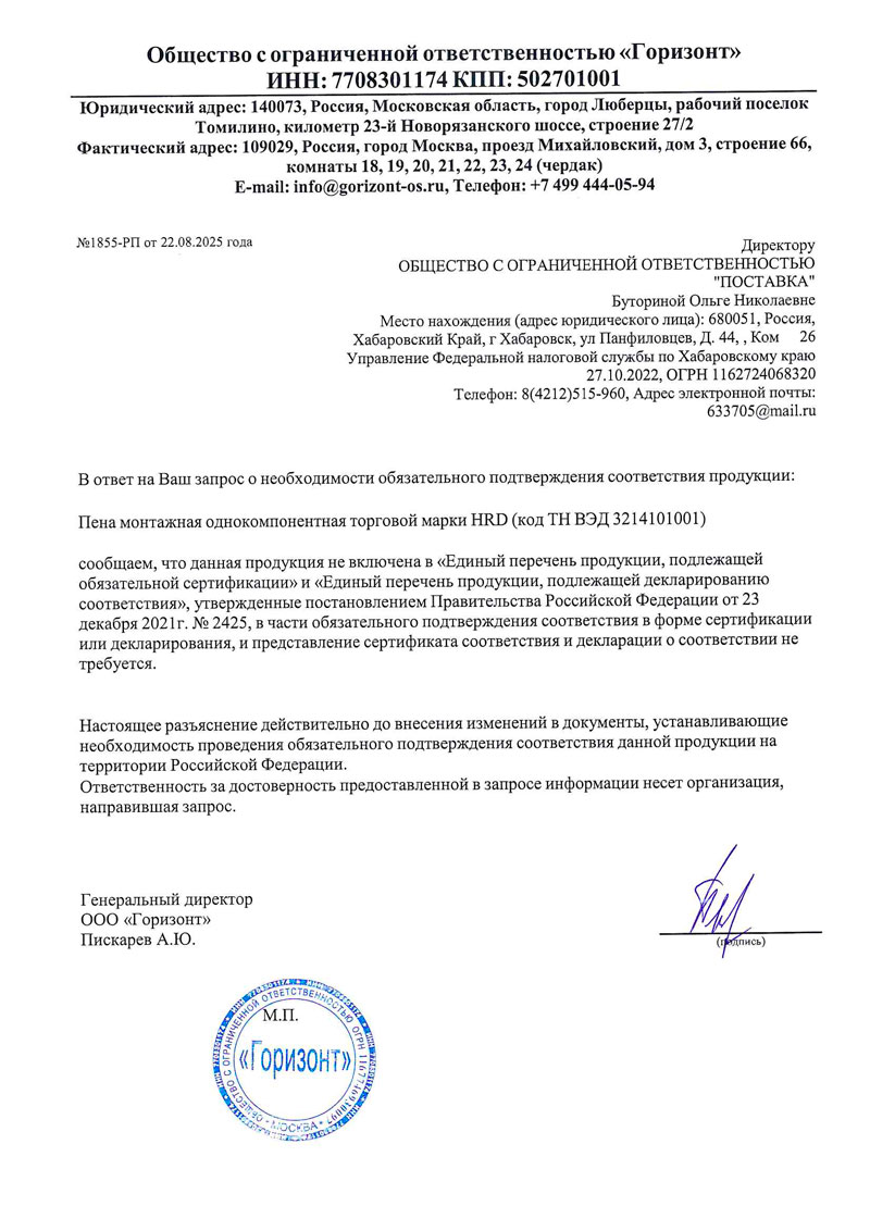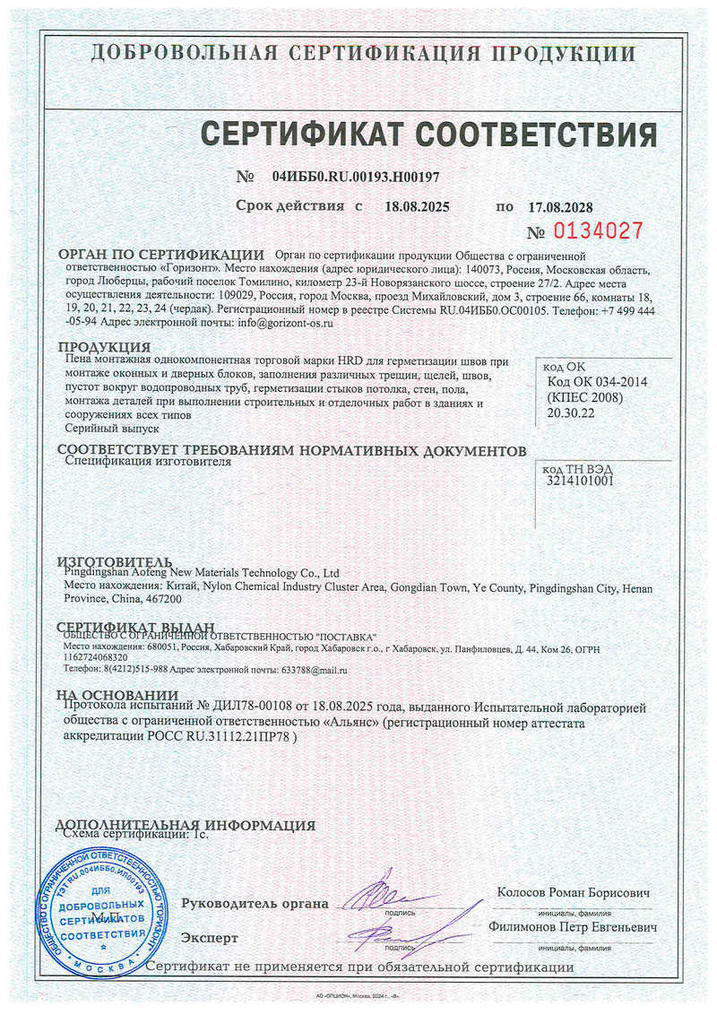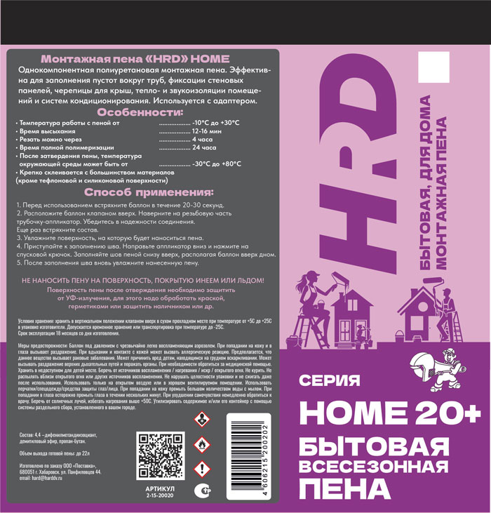Монтажная пена HDR HOME 20+ — компактная однокомпонентная полиуретановая пена с выходом до 22 л, предназначенная для бытового применения с адаптером. Подходит для заполнения пустот вокруг труб, фиксации стеновых панелей, кровельной черепицы, а также для тепло- и звукоизоляции помещений и систем кондиционирования. Обладает прочной адгезией к большинству строительных материалов, кроме тефлона и силикона. Рабочая температура от –10 °С до +30 °С, время высыхания 12–16 минут, полная полимеризация — 24 часа. После затвердевания сохраняет устойчивость при температуре от –30 °С до +80 °С.